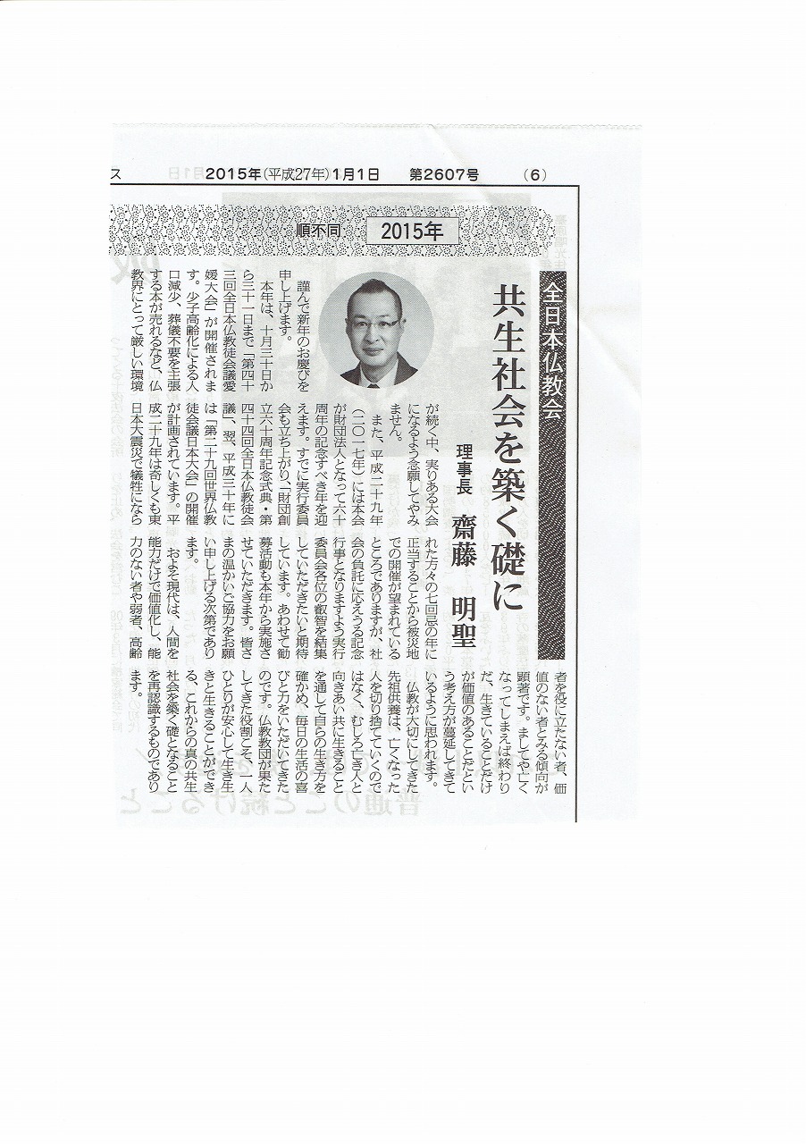 「仏教タイムス」新年号に理事長の抱負が掲載されました 投稿日 2014年12月31日2016年11月25日 「仏教タイムス」新年号、「新しい年を迎えて」というコーナーに理事長の所感が掲載されました。他紙にも掲載されていますが、同じような内容なので省略いたします。 画像をクリックしていただくと、大きな画面になります。 仏教タイムス新年号